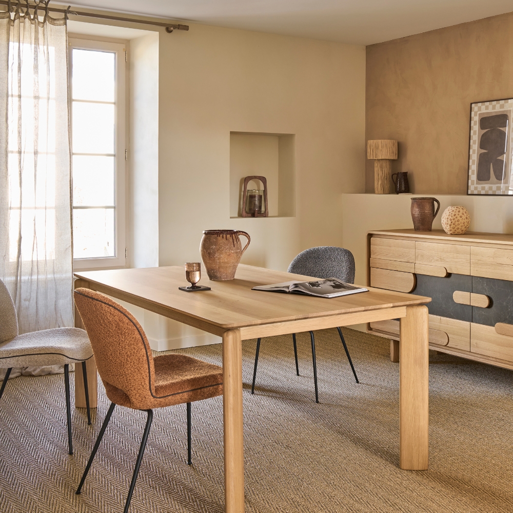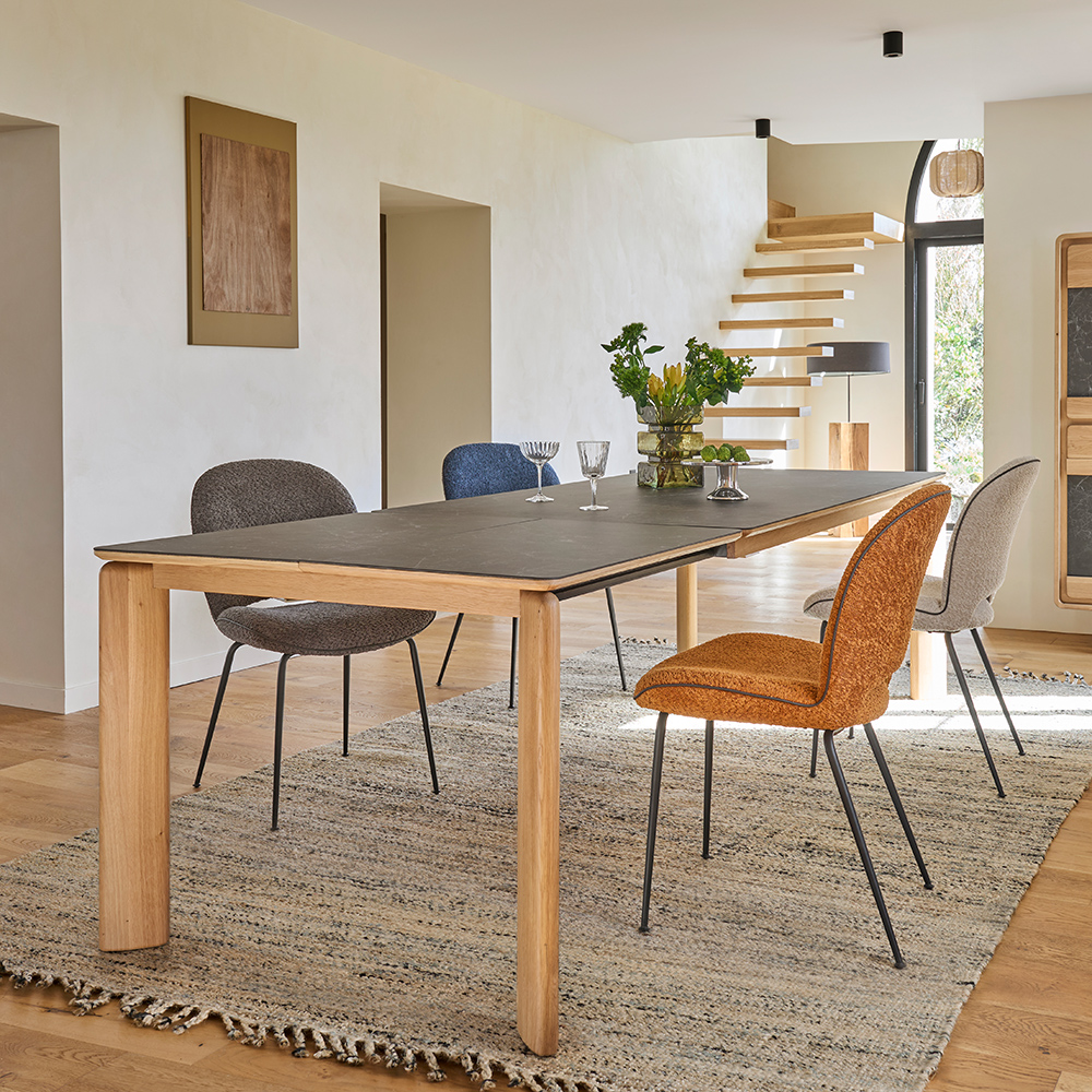 Son plateau, en chêne massif ou en céramique, repose sur un piétement aux lignes douces, créant une silhouette équilibrée et contemporaine. Le subtil décroché entre le pied et le plateau apporte légèreté et distinction. Grâce à son allonge portefeuille de 90 cm, elle s’adapte à vos invités et accompagne vos moments de convivialité sans compromis esthétique. Les finitions de bois et de céramique permettent de composer une harmonie raffinée avec votre intérieur.
