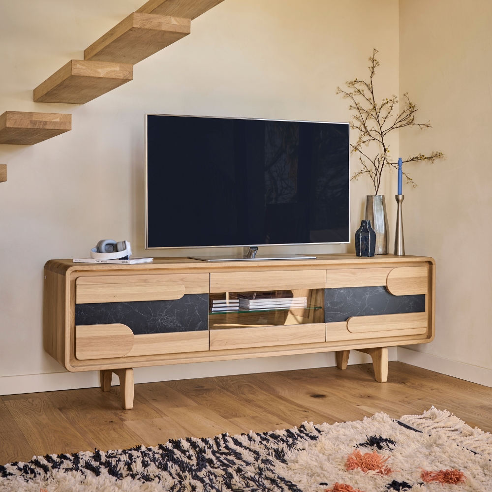 Ses lignes horizontales et le chêne massif travaillé en relief composent une façade structurée qui affirme sa présence. Derrière les portes, les tablettes réglables accueillent appareils et accessoires à l’abri des regards, tandis que le compartiment central vitré met en valeur vos objets et allège la composition. Disponible en longueur 180 cm et décliné en sept finitions de bois et trois variantes de céramique, il s’adapte naturellement à votre intérieur.