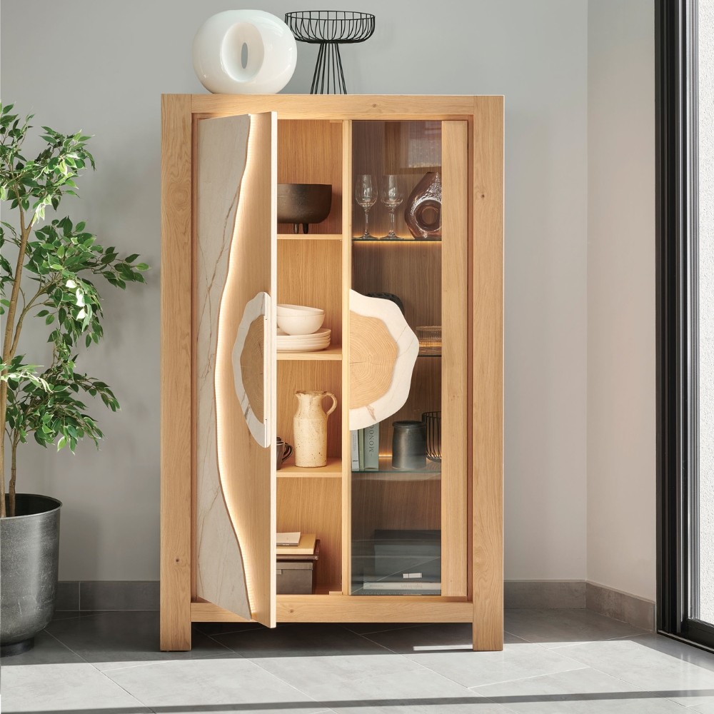 La vitrine MINERALE joue sur la transparence et la matière brute pour offrir un nouveau souffle à votre séjour. On apprécie la douceur de ses façades arrondies, où la céramique apporte une texture naturelle qui contraste avec la légèreté du verre. D’un simple geste sur l’interrupteur « Touch », une lueur délicate vient souligner les reliefs de la matière et mettre en valeur vos objets personnels. Plus qu’une simple vitrine, c’est une présence sereine qui capte la lumière et apporte une véritable respiration visuelle à votre pièce. Une invitation à profiter d’un intérieur apaisé au quotidien.