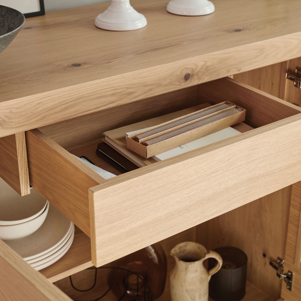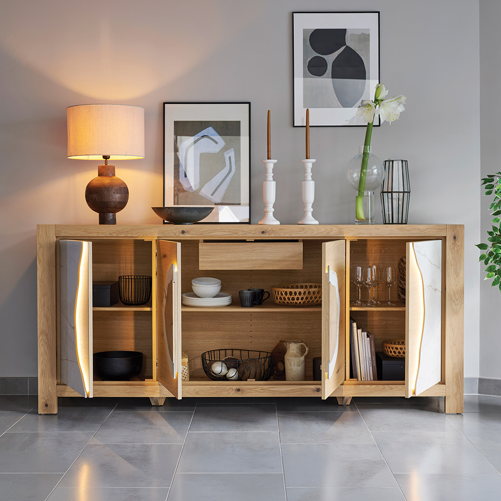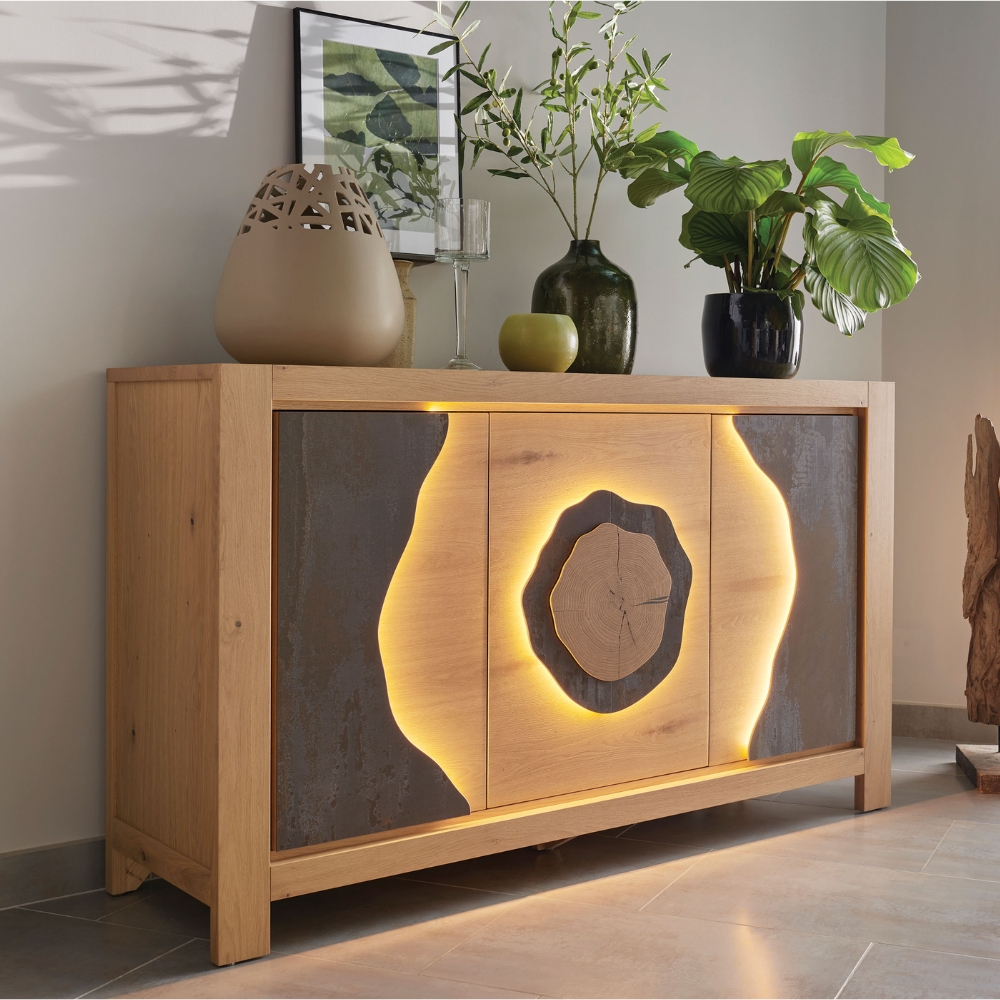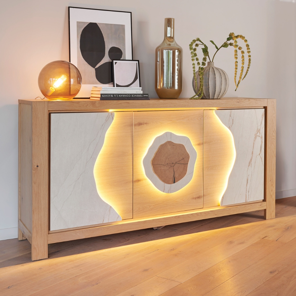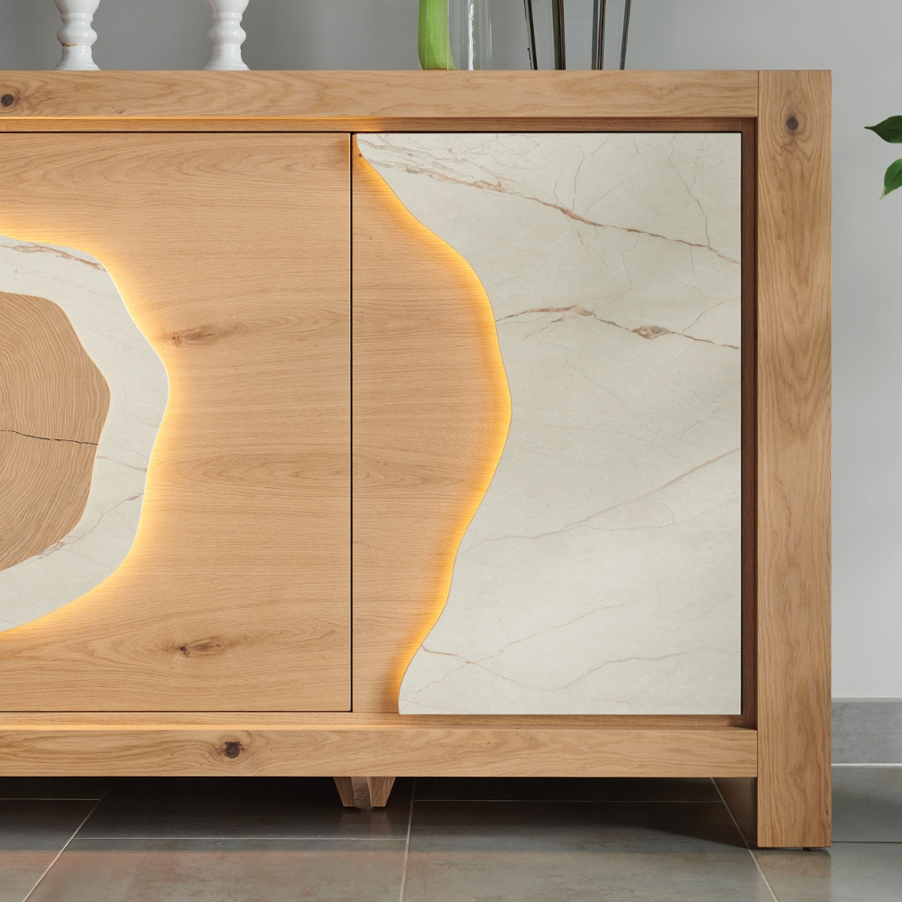 Le buffet MINERALE mise sur la pureté des matières pour apaiser votre intérieur. On se laisse séduire par le contraste tactile entre la fraîcheur de la céramique et la chaleur du bois, créant un équilibre naturel et relaxant. Sa façade aux découpes arrondies captive le regard, tandis que l’interrupteur « Touch » permet d’éveiller une lumière tamisée d’un simple geste. Plus qu’un meuble de rangement, c’est une présence sereine et élégante qui sculpte l’espace et invite à ralentir le rythme.