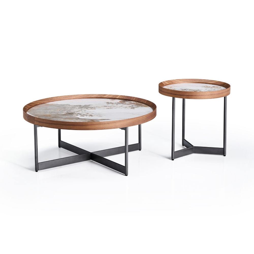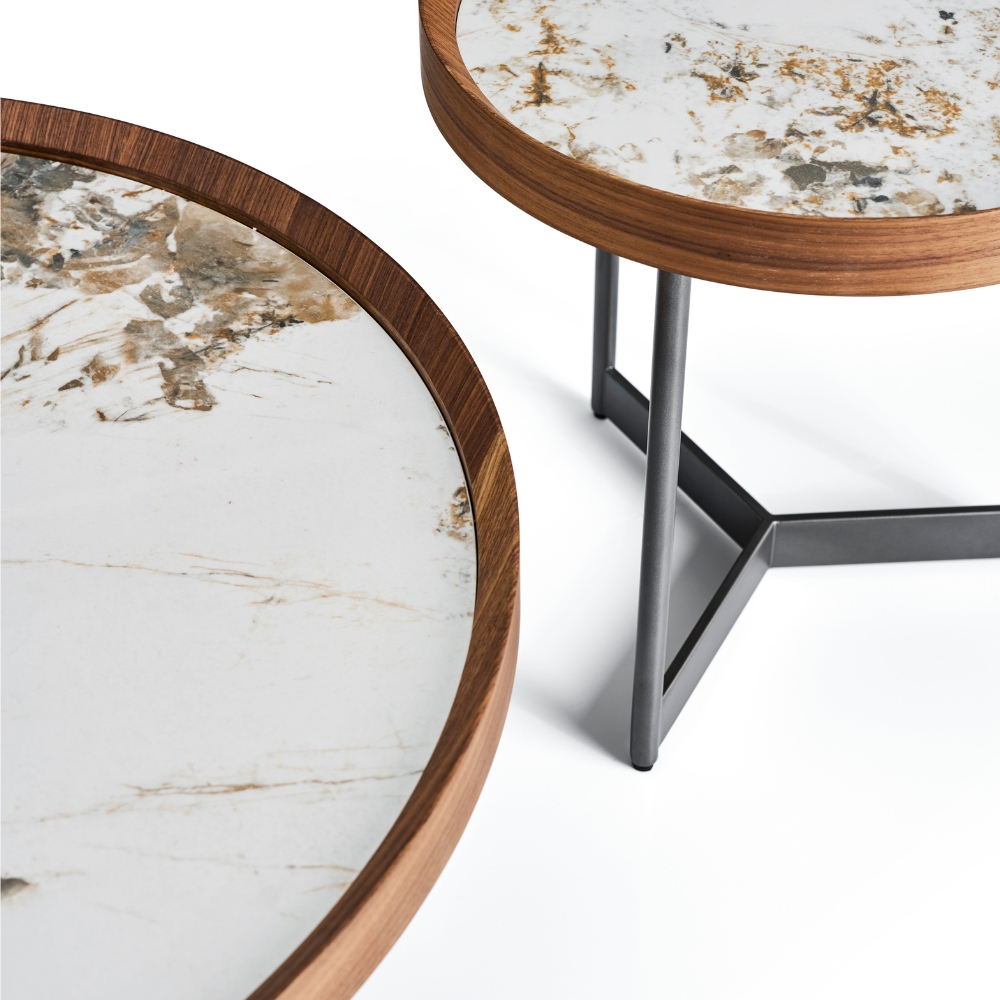 La table basse CRILLON joue sur le contraste entre la douceur lumineuse de sa céramique brillante et la profondeur chaleureuse du noyer. Son piétement en métal finition bronze ancre l’ensemble avec présence. La table basse de 90 cm et le guéridon assorti de 50 cm créent un jeu de proportions équilibré, qui structure l’espace avec clarté et élégance.